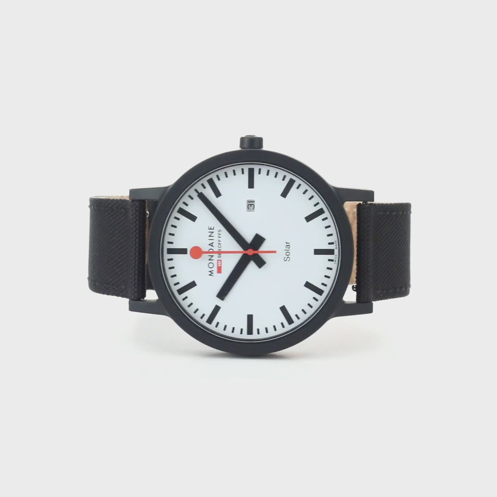 Powered entirely by light, the Mondaine essence solar combines iconic Swiss design with modern sustainability. At its heart beats a Swiss Made Ronda solar movement, charging through any light source and running for up to 8 months even in complete darkness once fully charged. The 41mm case is crafted from a renewable castor oil composite, while the black strap features a natural cork lining for comfort. With its crisp white dial, bold black markers, and the signature red seconds hand, this timepiece is both timeless and forward-thinking — designed to last, responsibly.